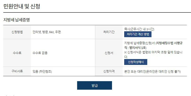 증명서 발급일을 기준으로 지방세를 체납된 세금이 없다는 것을 증명하는 서류입니다. 엄연히 납세내역 증명과는 다른 서류이므로 잘 확인하고 발급해야 합니다.