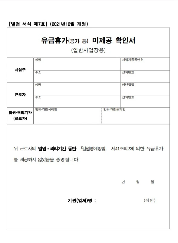 코로나19 자가격리 유급휴가 미제공 확인서 양식 hwp