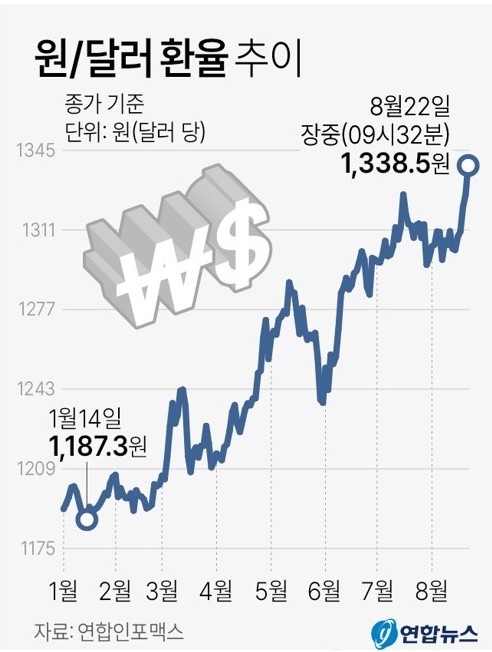 22일 원/달러 환율은 13년 4개월 만에 1,330원을 돌파했다. 오전 9시 55분 원-달러 환율은 전 거래일 종가보다 12.0원 오른 1,337.9원을 기록했다. 환율은 전 거래일 종가보다 달러당 9.6원 오른 1,335.5원에 개장해 장 초반 고점을 1338.5원으로 끌어올리며 1,340원 선을 돌파하고 있다.